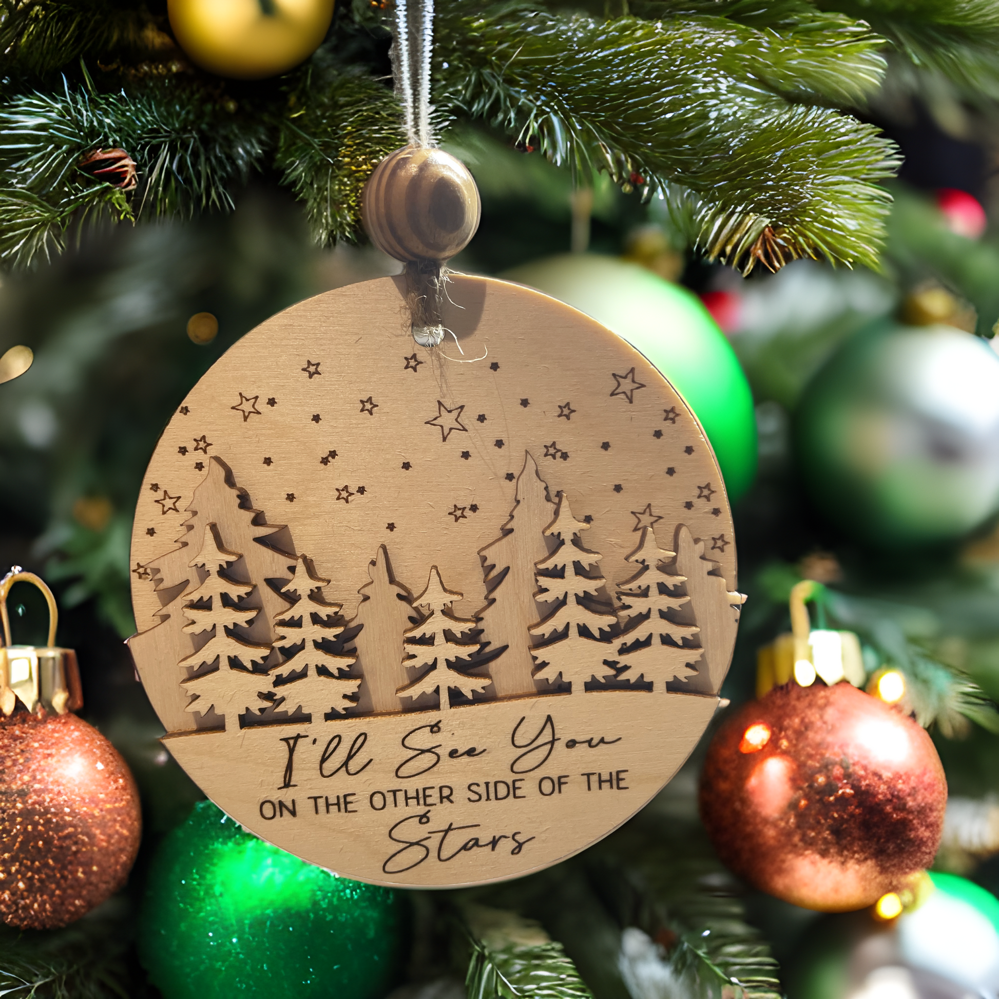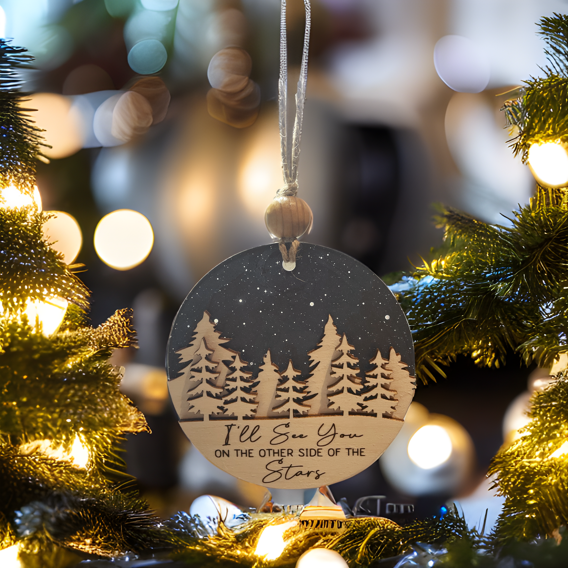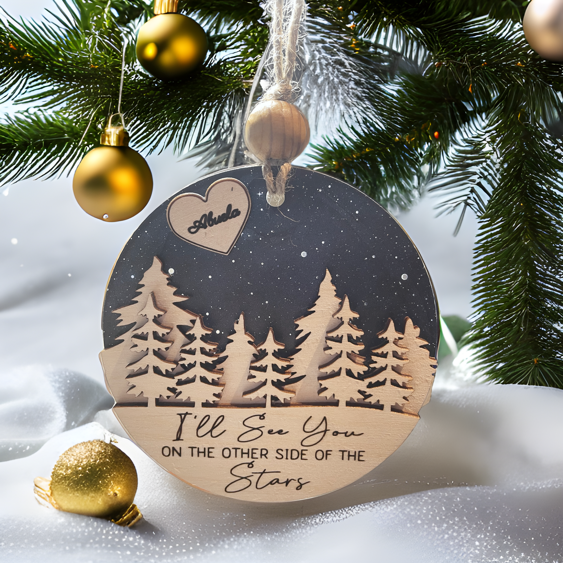 Cherish the memory of a loved one with this heartfelt Christmas memorial ornament, engraved with the touching phrase, "I'll see you on the other side of the stars." This elegant keepsake serves as a gentle reminder that, although separated for now, the bonds of love remain unbroken and eternal. Perfect for hanging on your Christmas tree or as a display piece, it symbolizes hope, connection, and the promise of a reunion beyond the stars. Crafted with care and thought, this ornament can be personalized with an added charm featuring their name, making it a truly unique and meaningful tribute to those who continue to shine in our hearts, even from afar.