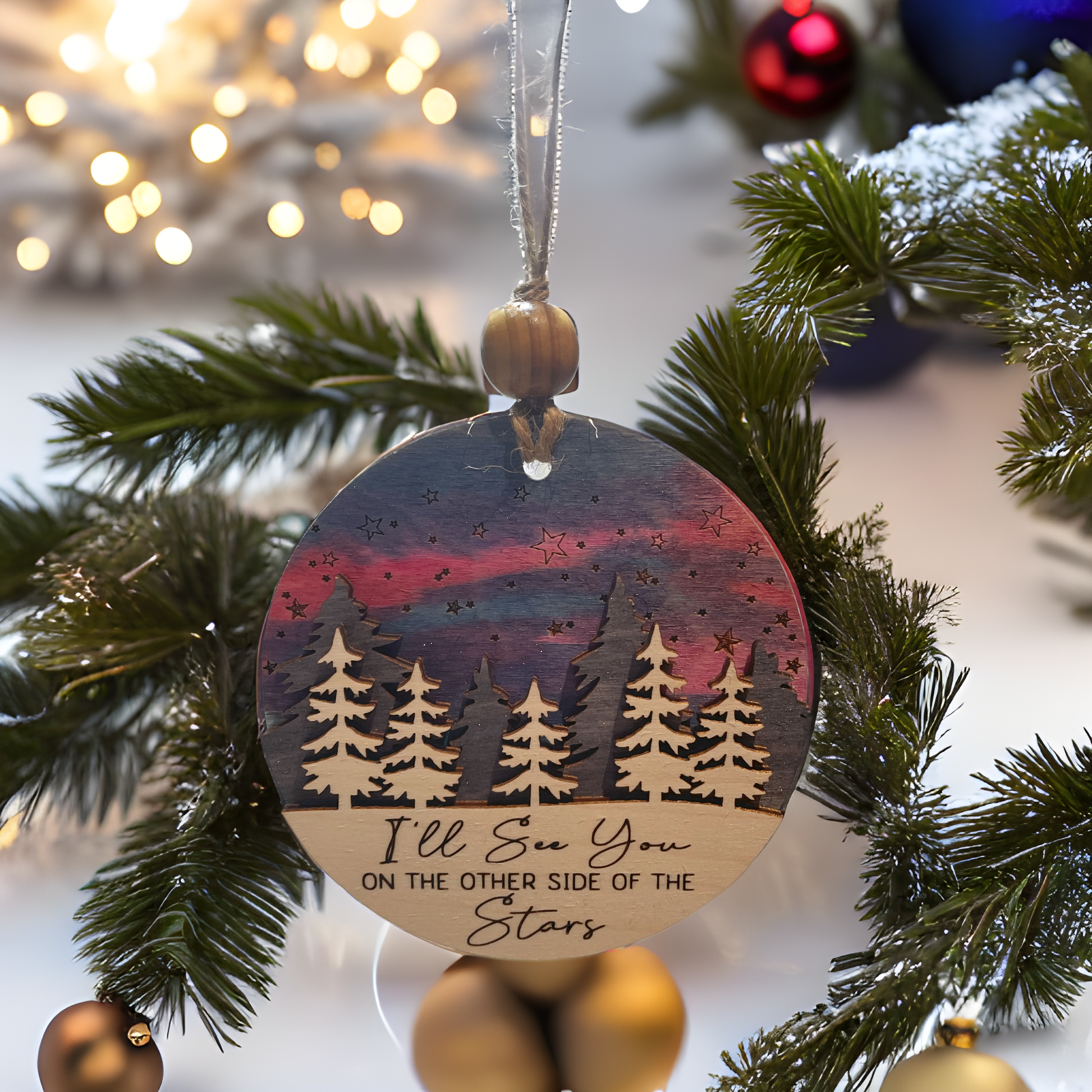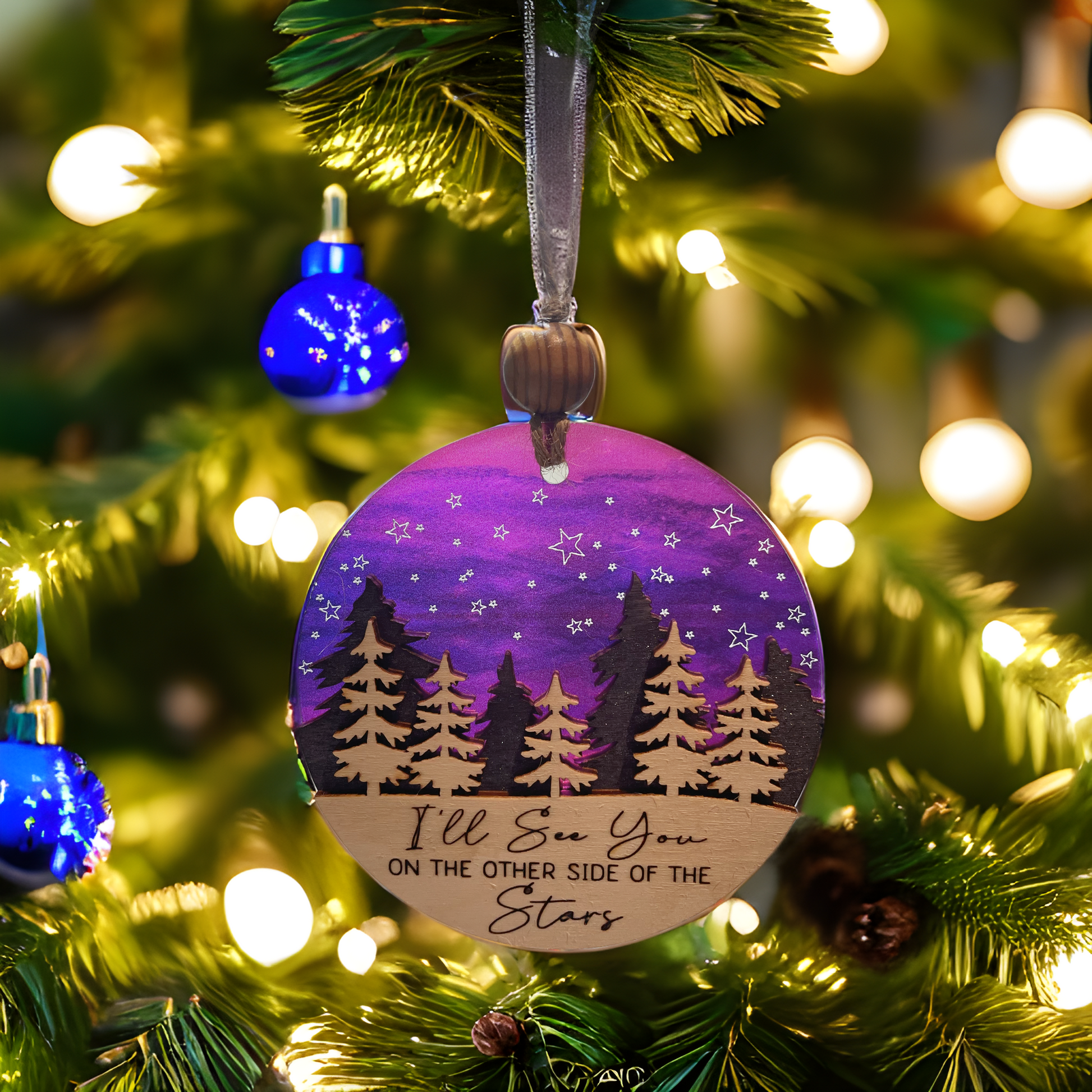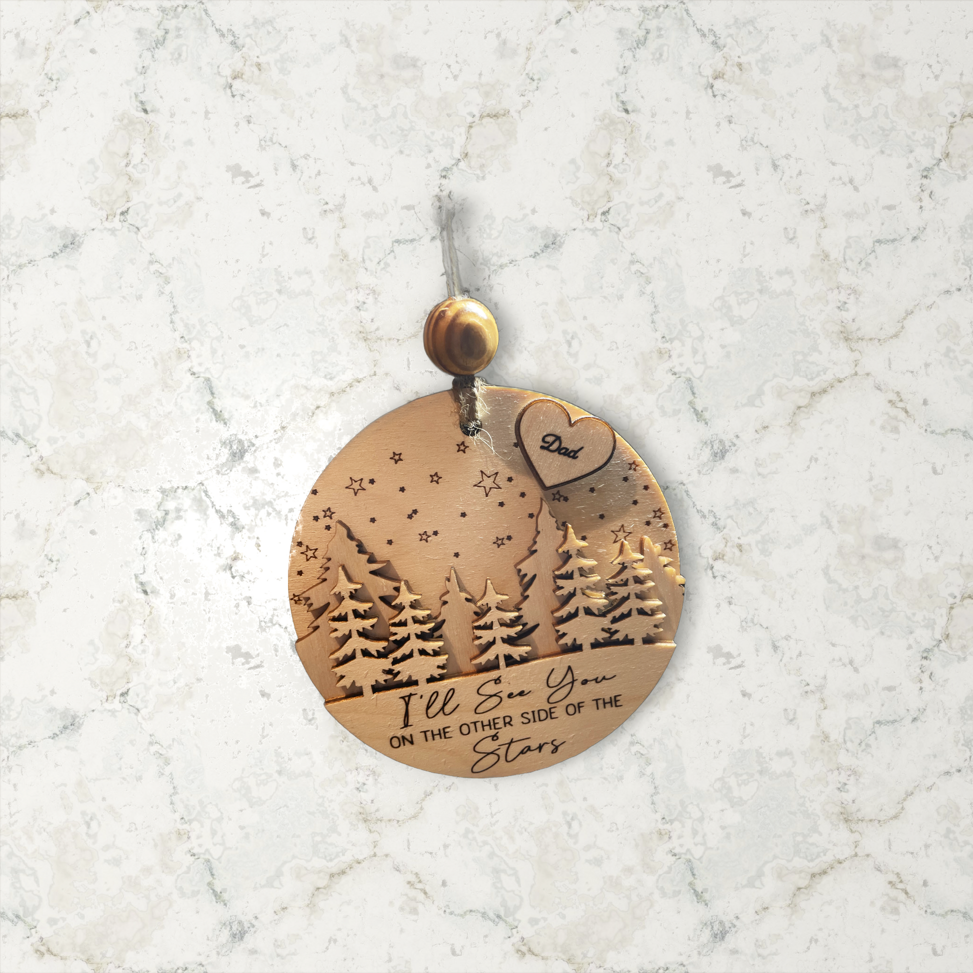 Cherish the memory of a loved one with this heartfelt Christmas memorial ornament, engraved with the touching phrase, "I'll see you on the other side of the stars." This elegant keepsake serves as a gentle reminder that, although separated for now, the bonds of love remain unbroken and eternal. Perfect for hanging on your Christmas tree or as a display piece, it symbolizes hope, connection, and the promise of a reunion beyond the stars. Crafted with care and thought, this ornament can be personalized with an added charm featuring their name, making it a truly unique and meaningful tribute to those who continue to shine in our hearts, even from afar.